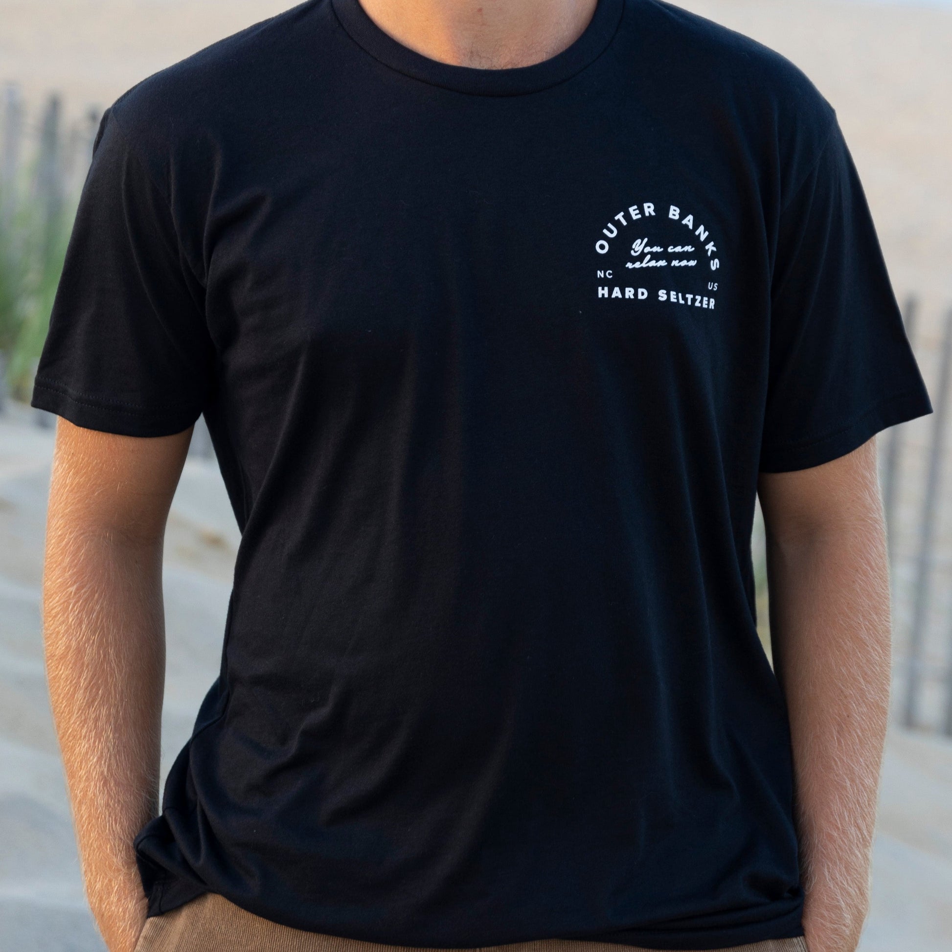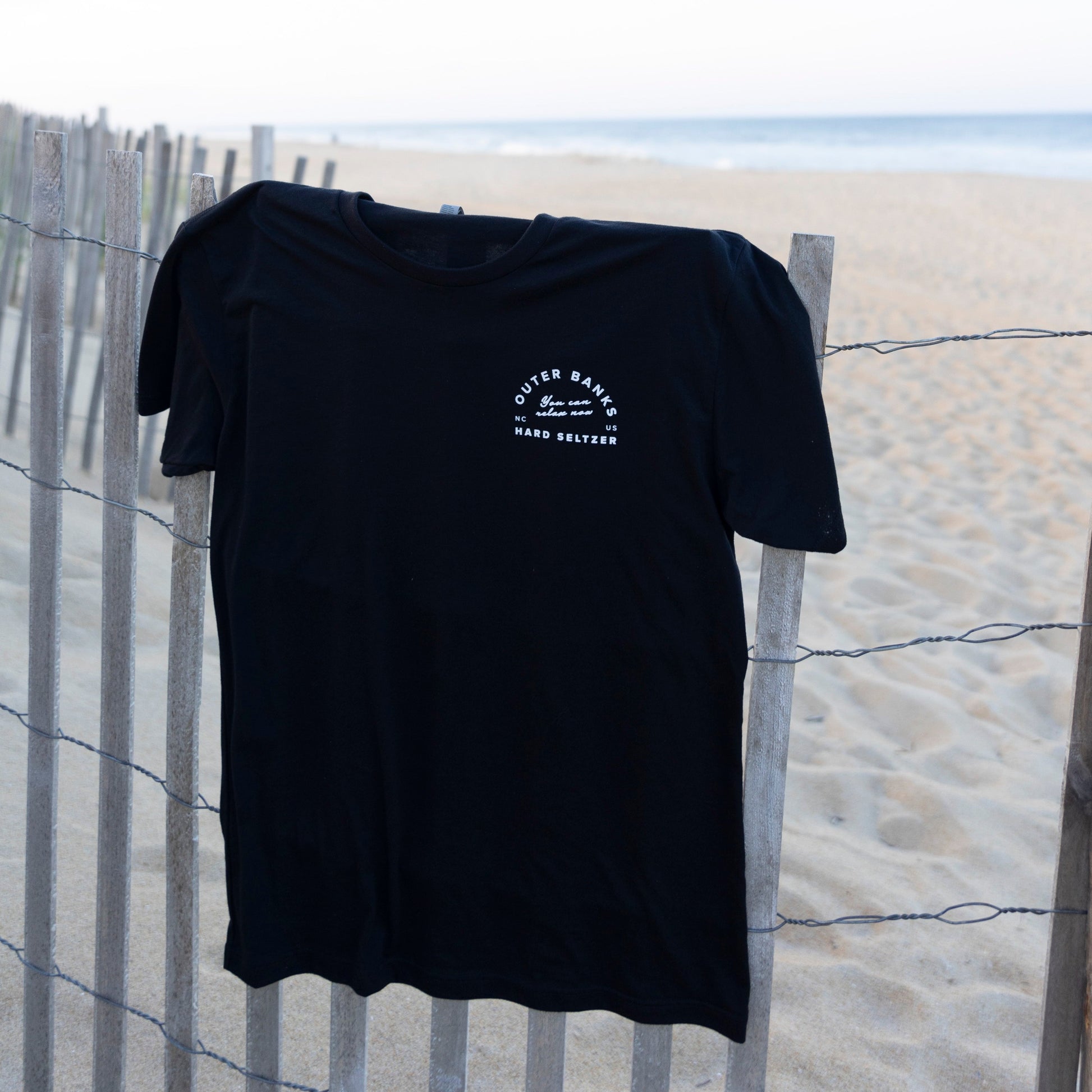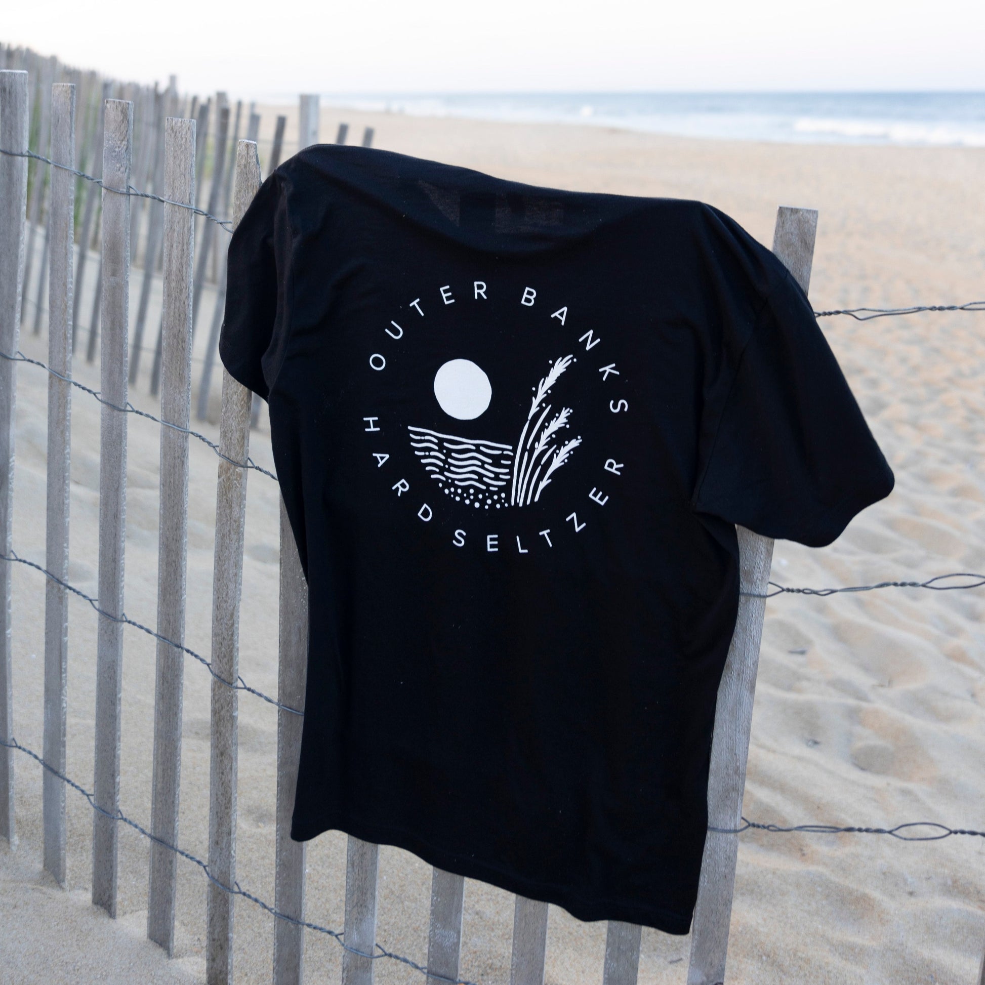 A super soft, black t-shirt with white Outer Banks Hard Seltzer icon on the front left chest and Outer Banks Hard Seltzer logo on the back.